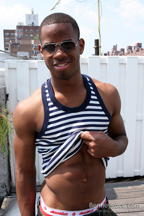 I love sexy black guys and when I saw Mikey I knew that I wanted to see him naked. I was really surprised when he had no problem with stripping for me on a rooftop in Manhattan with all the world to see. He posed and showed off his beautiful body and big cock. The other guys on the rooftop deck loved the show as well. I’ve just finished posting Mikey’s rooftop shower shots and his jerk off video. Mikey is a 19 y/o straight student living in New York. I met him there during my trip there this month.